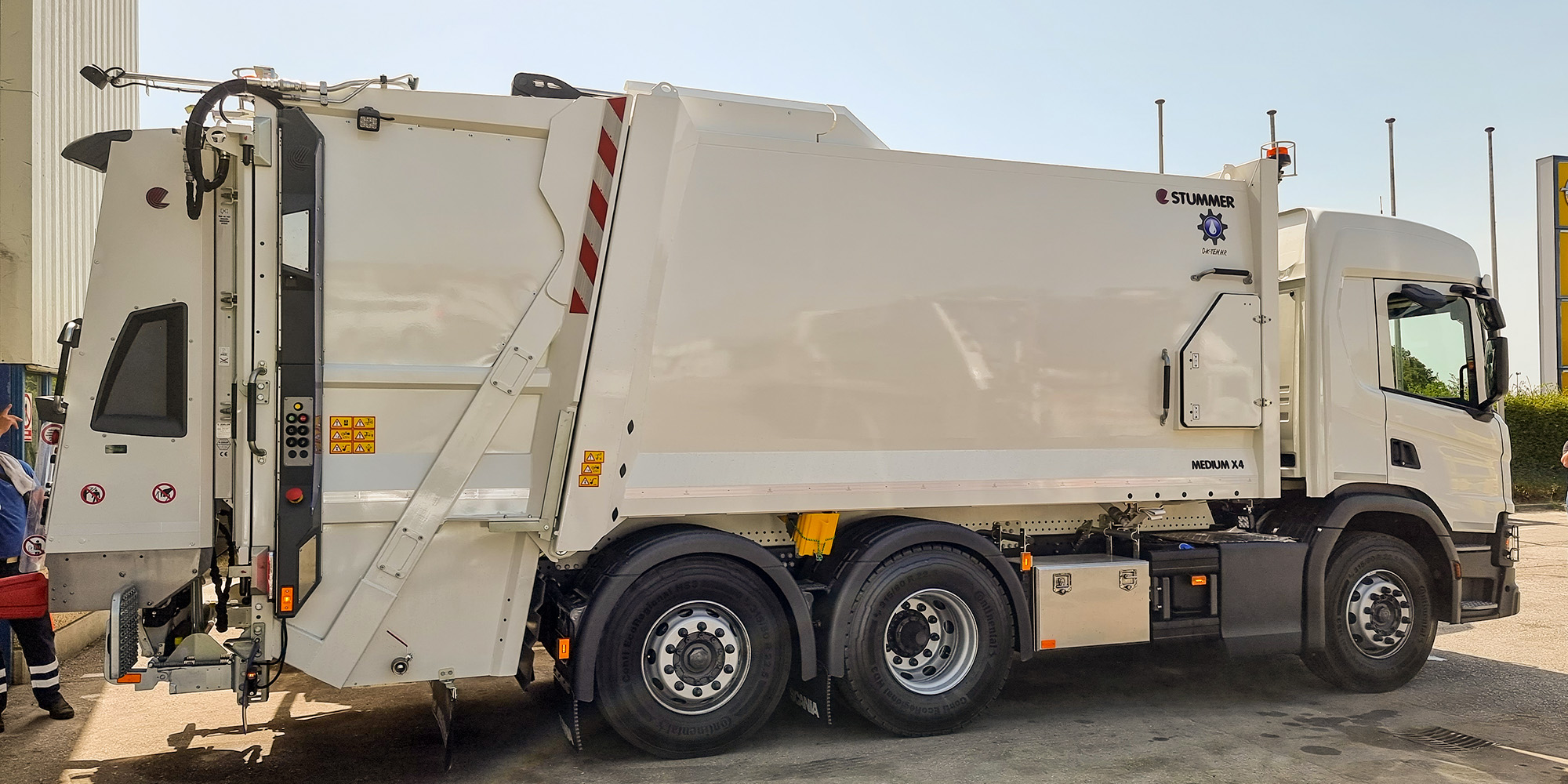 Isporučili smo drugo od 26 vozila grupaciji C.I.O.S., odnosno tvrtki Eko Flor plus d.o.o. Riječ je o podvozju Scania P370B6X2*4NA na koje je ugrađena nadogradnja za prikupljanje otpada marke Stummer, model MEDIUM X4 s podizačima ZOELLER DELTA 2322 Automatic.